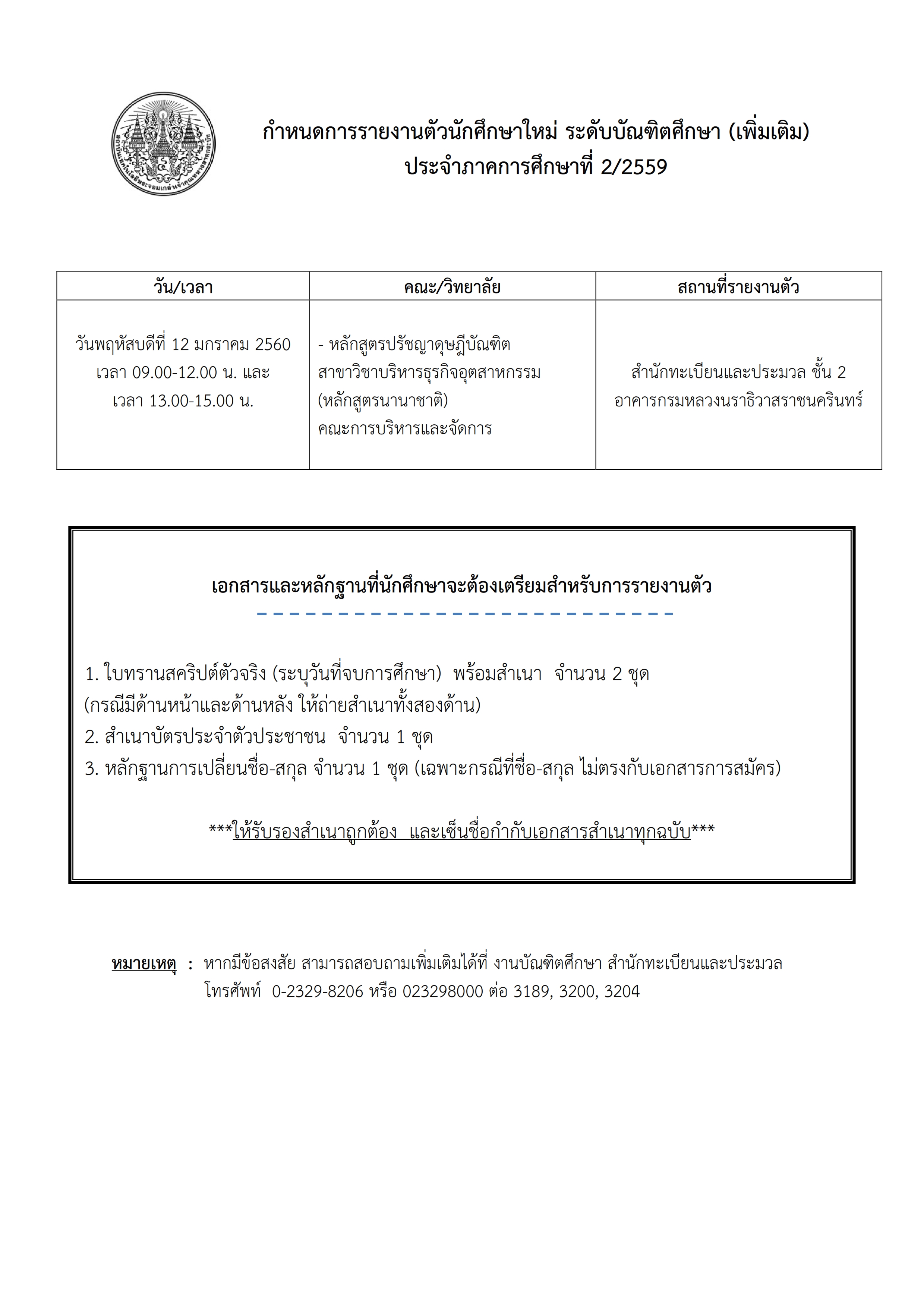 ประกาศ กำหนดการรายงานตัวนักศึกษาใหม่ ระดับบัณฑิตศึกษา (เพิ่มเติม) ประจำภาคการศึกษาที่ 2/2559